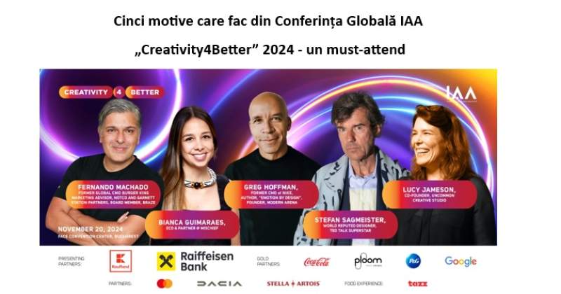Creativity4Better 2024 oferă un spațiu de reflecție și inspirație pentru toți cei care doresc să își redefinească perspectivele creative, fie că sunt profesioniști din marketing și publicitate, antreprenori la început de drum, sau simpli pasionați ai industriei. Conferința Globală IAA „Creativity4Better” urmează să devină epicentrul celor mai interesante idei și să ofere participanților ocazia de a fi surprinși, provocați și inspirați de discursurile unora dintre cele mai strălucite minți din industrie.