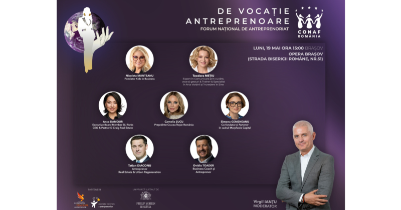 Forumul Național DE VOCAȚIE ANTREPRENOARE este o inițiativă a Confederației Naționale pentru Antreprenoriat Feminin – CONAF, în parteneriat cu Asociația Națională a Antreprenorilor - ANAA, Patronatul Femeilor Antreprenor - PFA și susținută de Philip Morris România, cu scopul de a determina, prin forța conținutului său premium, o schimbare de mentalitate, o accelerare, dar și o coagulare a unei comunități cu potențial uriaș – antreprenoriatul feminin.