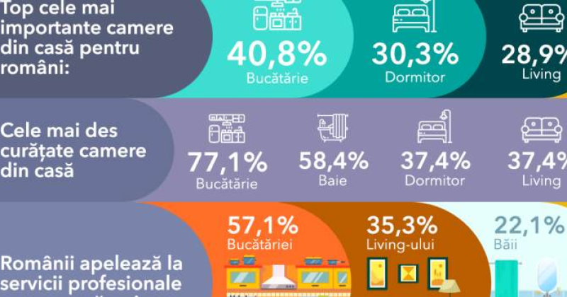 Românii s-au declarat interesați să apeleze de asemenea, la serviciile profesioniștilor pentru servicii de amenajări interioare (57,1%), servicii de curățare canapele și/sau fotolii (55,8%), servicii de curățare covoare (52,4%), servicii de montare și igienizare aparate de aer condiționat (37,1%) și curățare saltele (36,1%).