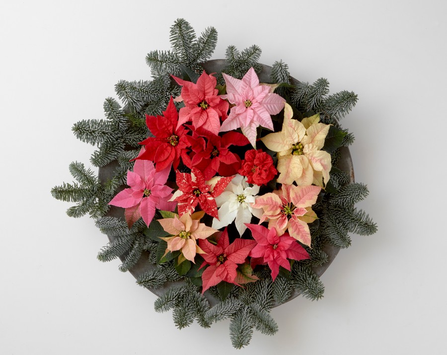 Nu știți ce culoare să alegeți pentru aranjamentul cu crăciunițe? Atunci un aranjament vesel, de mini crăciunițe este nu doar ceea ce căutați, ci și ce aveți nevoie! Așezați flori de crăciuniță multicolore pe o farfurie sau o tavă. Opțional, puteți decora întreaga farfurie cu luminițe, conuri de brad sau globuri.
