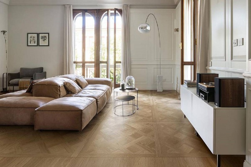 Pentru un design modern, optați pentru gresie tip parchet în tonuri de gri sau albe. Aceste culori neutre creează un fundal perfect pentru mobilierul vibrant și plantele colorate. În plus, modelele cu plăci mari creează un efect vizual impresionant, mărind vizual spațiul.