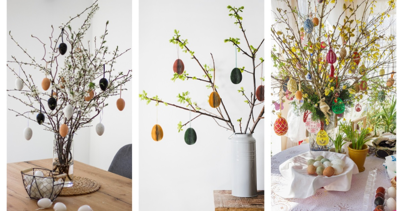 Aceste ouă suspendate de crenguțe pot fi realizate din hârtie sau carton pictat, lemn sau ceramică ușoară, plastic reciclat sau chiar din aluat copt (da, puteți chiar coace în cuptor aceste decorațiuni), după preferințe sau ce aveți prin casă și care să vorbească totodată despre primăvară și sărbătoarea naturii în acest anotimp. Bineînțeles că acest concept nu este o noutate în ciuda aspectului contemporan al acestor copaci de Paște. Ei sunt inspirați din Ostereierbaum, o tradiție germană veche de secole de a decora copacii cu ouă.