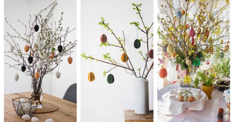 Puteți adăuga printre crenguțele de care sunt suspendate ouale decorative de Paște (în nuanțe pastelate pentru accente vesele sau în nuanțele lor naturale pentru a crea un décor mai rustic și natural), și crenguțe cu bumbac (dacă dispuneți de așa ceva) pentru un efect mai deosebit sau chiar luminițe subtile. Ouăle pe care le atârnați de crenguțe trebuie să fie ușoare, așa că plasticul, lemnul sau hârtia decupată sunt materialele preferate pentru a realiza un astfel de pom de Paște, un fel de alternativă a pomului de Crăciun.
