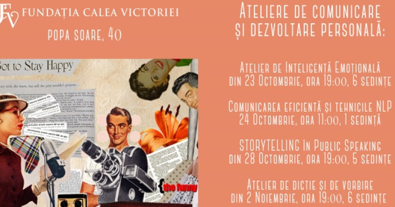 Atelier de DICTIE si de vorbire, din 2 Noiembrie - Cuvântul, vorbirea, este semnatura mintii si a sufletului tau. Cuvântul poate sa-ti fie prieten sau dusman, el declanseaza controlul tau interior. Trebuie doar sa stii sa il stapânesti. La acest curs iti vei constientiza propriul tip de vorbire si cum poti pronunta cuvintele astfel incât dictia lor sa fie perfecta si efectul lor maximizat.