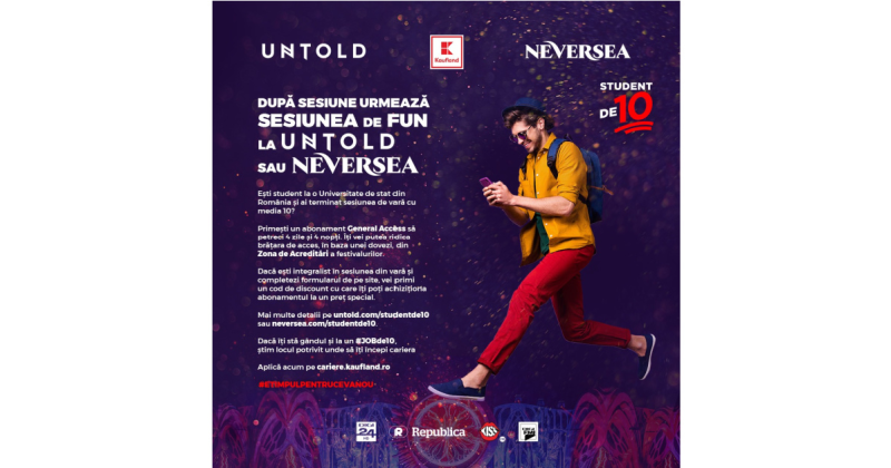 Edy Chereji, Co-Fondator UNTOLD și Neversea: “Această campanie, “Student de 10”, este o campanie care aduce multă bucurie in rândul tinerilor cu rezultate excelente. E momentul în care răsplătim excelența și performanța în educație cu experiențe memorabile pentru absolvenții de 10. Cei care iau notă maximă la sesiunea de vară sunt invitații noștri la UNTOLD și Neversea.”