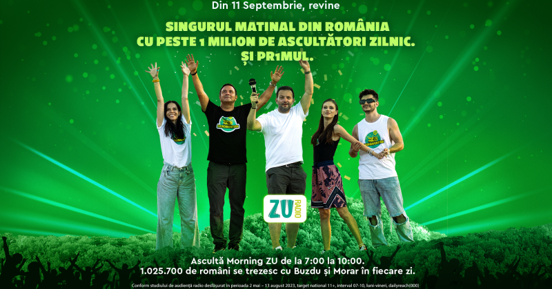 Din 11 septembrie, revine #MorningZU - singurul matinal din România cu peste 1 milion de ascultători zilnic. Un alt mod de a spune „Te iubesc”: 1.025.700 de români se trezesc cu Buzdu și Morar în fiecare zi, de la 7.00 la 10.00.