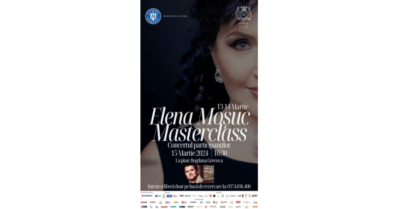 Vineri, 15 martie, ora 18:30, Opera Națională București vă așteaptă la un veritabil concert masterclass susținut de marea soprană Elena Moșuc. Recunoscută drept una dintre cele mai versatile şi mai expresive soprane ale perioadei contemporane, cu o carieră internaţională de peste trei decenii, soprana Elena Moșuc se bucură de un succes deplin pe cele mai mari scene de operă ale lumii. Vă invităm, așadar, să participați la un eveniment muzical extraordinar în care soprana de renume mondial Elena Moșuc – acompaniată la pian de Bogdana Grecova – va împărtăși tainele belcantoului cu tânara generație de artiști lirici. Evenimentul va avea loc în Foaierul Galben al Operei Naționale București. Intrarea este liberă, în limita locurilor disponibile, doar pe bază de rezervare la numerele de telefon 0743.069.630 sau 0374.030.137.