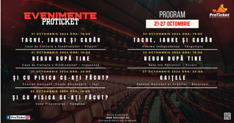 Bilete disponibile la toate spectacolele pe https://proticket.ro/.