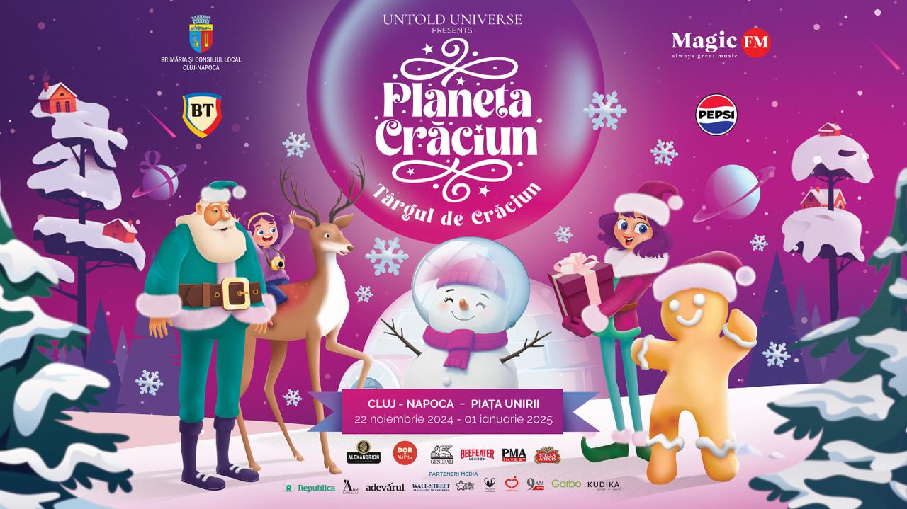 Pentru cel de-al doilea an consecutiv, cele două târguri de Crăciun organizate de UNTOLD Universe la Cluj-Napoca - cel din Piața Unirii și cel de pe platoul Sălii Sporturilor “Horia Demian” se află sub conceptul ,,Planeta Crăciun”. ,,Planeta Crăciun” aduce în Piața Unirii din Cluj-Napoca, între 22 noiembrie și 1 ianuarie 2025, o mulțime de surprize și atracții precum: o roată panoramică, ce va avea un show de lumini unic în România, un carusel de poveste și o sanie VR, unde curioșii se vor putea bucura de o drumeție cu ajutorul echipamentelor de realitate virtuală pe drumul renilor înspre casa lui Moș Crăciun din Laponia. Nelipsită va fi și Căsuța lui Moș Crăciun, unde cei mici vor putea face fotografii, se vor întâlni cu bătrânelul care aduce daruri tuturor și vor participa la peste 20 de ateliere creative diferite. Atmosfera de sărbătoare va fi întreținută și de prezența personajelor ,,Planetei Crăciun”: Crăciunir, Frim, Ona, Mira, Rexy. Anul acesta line-up-ul artistic va fi format atât din trupe îndrăgite, cât și din artiști consacrați pentru colindele de Crăciun, devenite tradiție an de an.