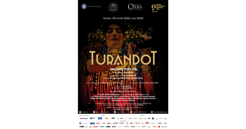 Enigmatica poveste de iubire inspirată după un basm persan va fi povestită publicului bucureștean prin vocile sopranelor Bianca Mărgean (Turandot) și Manuela Barna-Ipate (Liù) a tenorului Zi-Zhao Guo (Calaf), ale bașilor Cezar Octavian Ionescu (Ping), Ivan Dikusar (Timur) și Dmytro Melnyk (Mandarinul) și ale tenorilor Ovidiu Manolache (Pong), Petru Pavel (Pang) și Adrian Ionescu (Împăratul Altoum). Cu participarea Corului, Corului de Copii, Baletului și Orchestrei Operei Naționale Române din Iași.