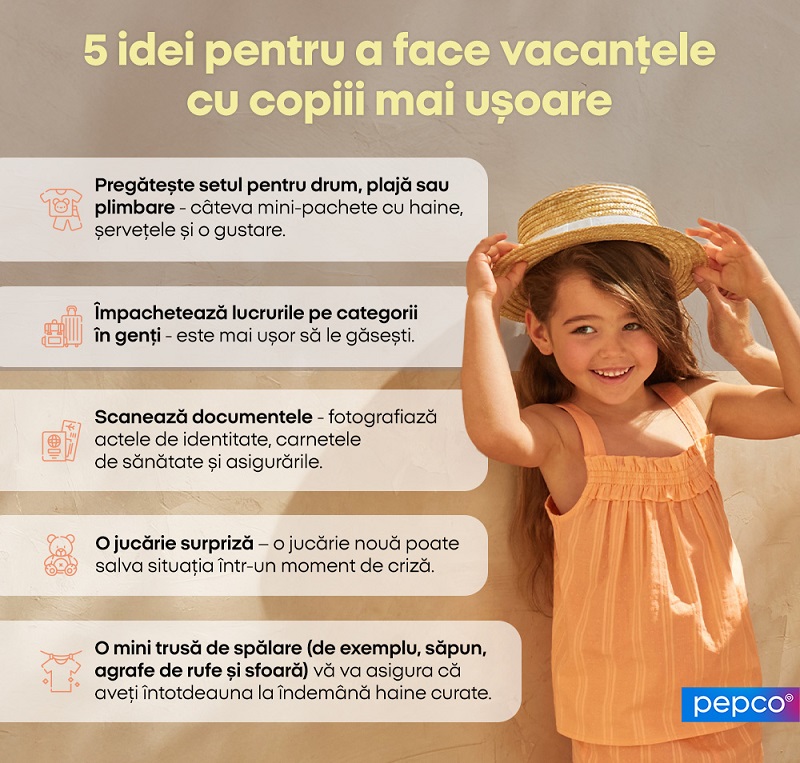 Destinațiile de vacanță cu copiii se caracterizează prin faptul că, întotdeauna uiți ceva ce merită să ai la îndemână și la care nu te-ai gândit. De aceea, merită să intri pe la Pepco înainte de a pleca pentru a completa accesoriile și lucrurile care pot salva multe situații. Bidoane colorate, pungi pentru mărunțișuri, mini caserole pentru gustări, prosoape cu motive pentru copii sau haine ușoare de vacanță, care nu vor ocupa mult spațiu, dar se pot dovedi neprețuite.