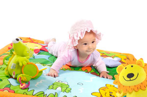 Se recomanda jucariile frumos colorate, cele care scot diferite sunete, mingiile de cauciuc, jucariile din material texil hipoalergen moi si pufoase fara aceesorii ce pot pune in pericol viata copilului (nasturi sau mustati ale jucariilor de plus etc).