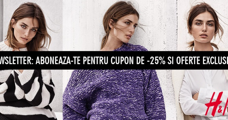 Abonandu-te la acest newsletter vei beneficia de reducere de 25% la produsul preferat si vei afla de oferte exclusive si de ultimele noutati de pe podiumurile internationale! In plus, vei fi printre primii clienti care se va bucura de inaugurarea online a magazinului H&M!