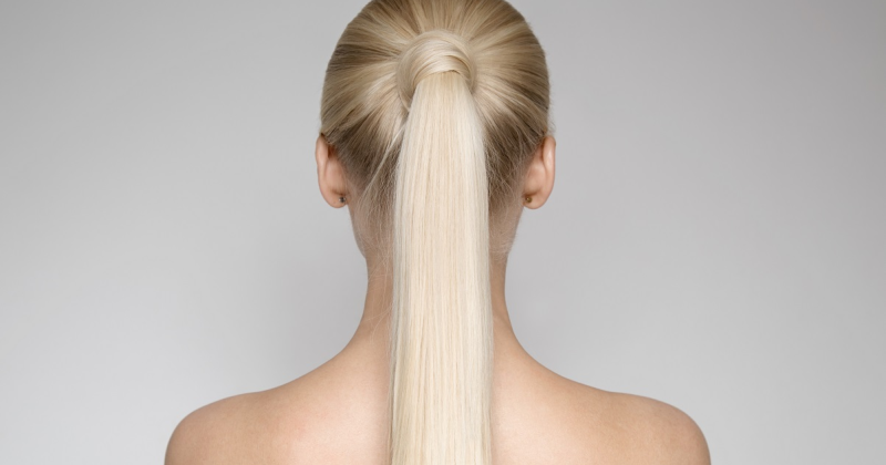4. După ce ți-ai strâns părul, alege o șuviță subțire din coadă și răsucește-o în jurul elasticului. Fixeaz-o cu ajutorul unei agrafe de păr