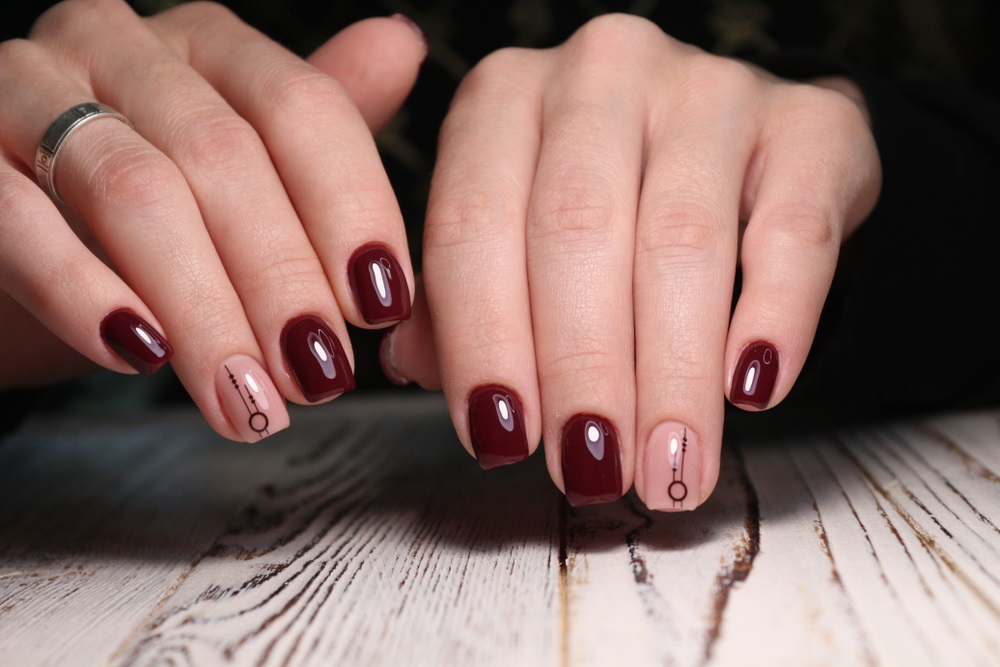Manichiură roșu închis cu spații negative și detalii minimaliste