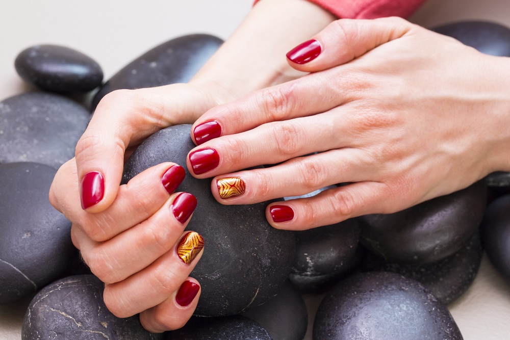 Motivele geometrice nu au ieșit încă din tendințe și sunt de nelipsit și de pe manichiurile roșii mate