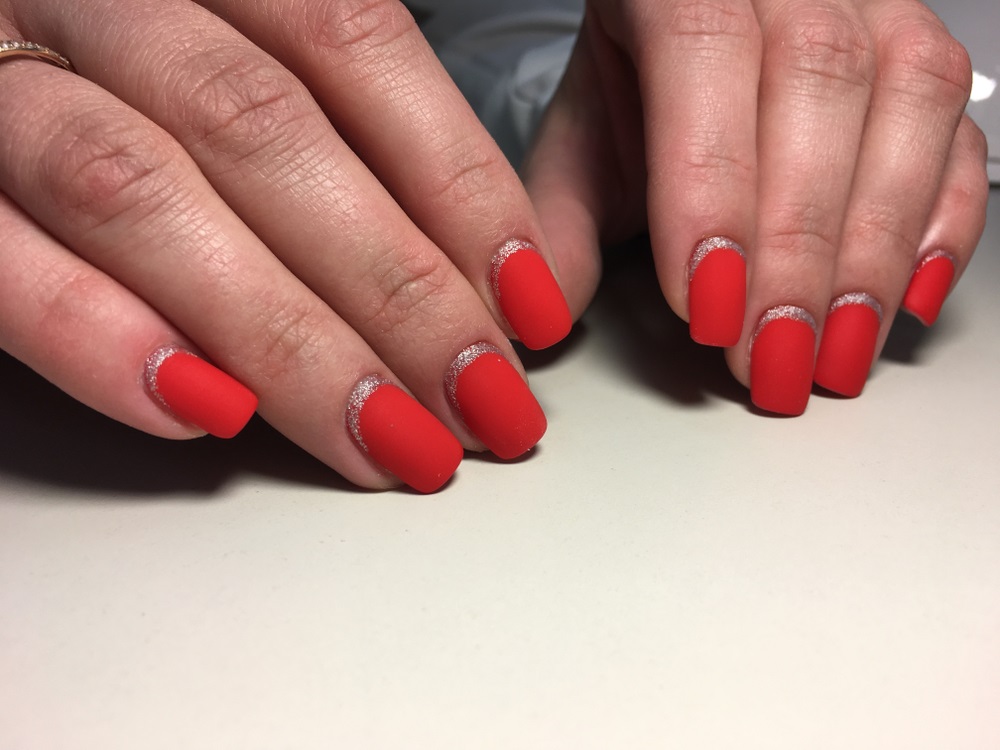 Manichiura french pe jumătate, cu vârfurile și marginile parțial pictate cu oja roșie. Mai puțin înseamnă mai mult uneori!