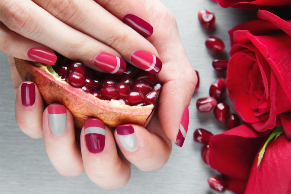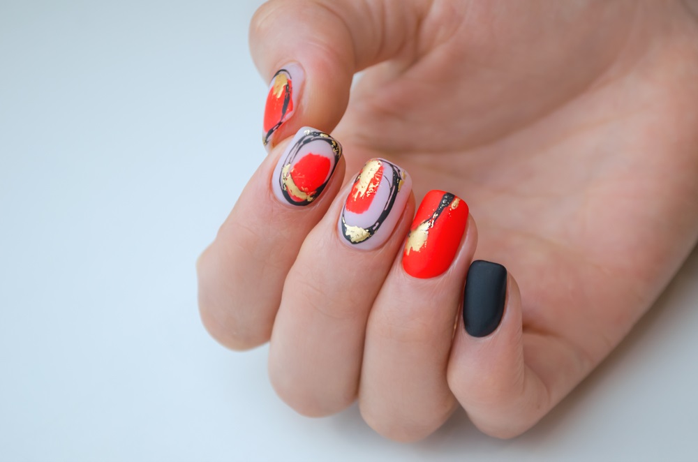 Manichiură nail art asimetrică pe bază de roșu, roz și gri