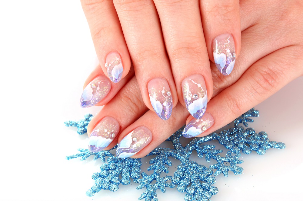 Foto: CHRISTINA RADCLIFFE /Shutterstock Foto: Kornovan Yuliia /Shutterstock Foto: JamesFarleyPhotos /Shutterstock Foto: Marina mrs_brooke /Shutterstock Foto: Alexander_Safonov /Shutterstock Foto: Elena Grama /Shutterstock3. Unghii de Crăciun: tonuri reci de iarnă și modele speciale pe unghii