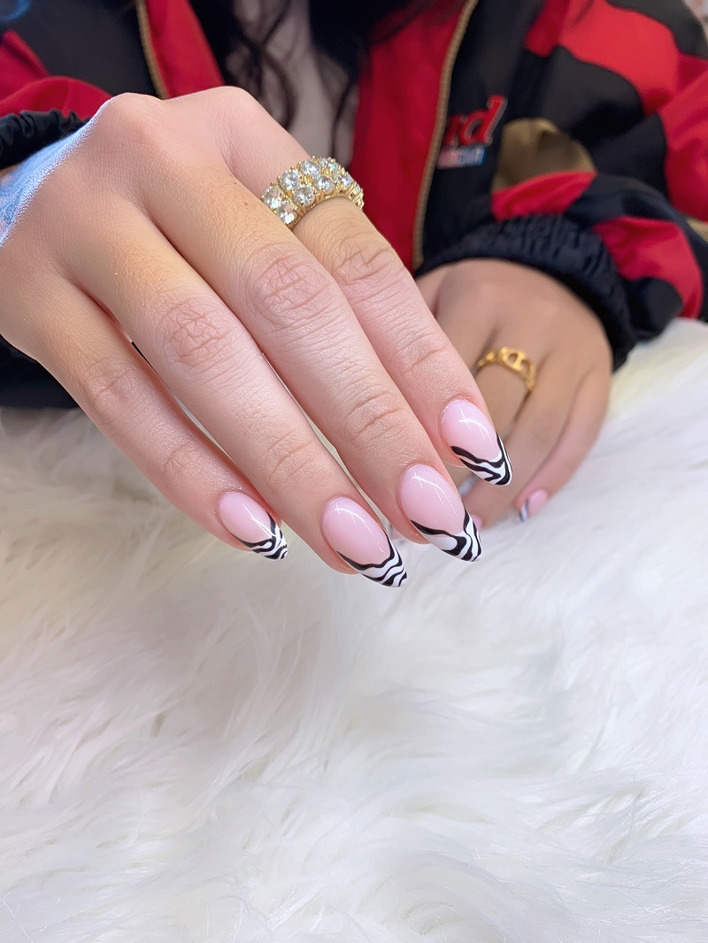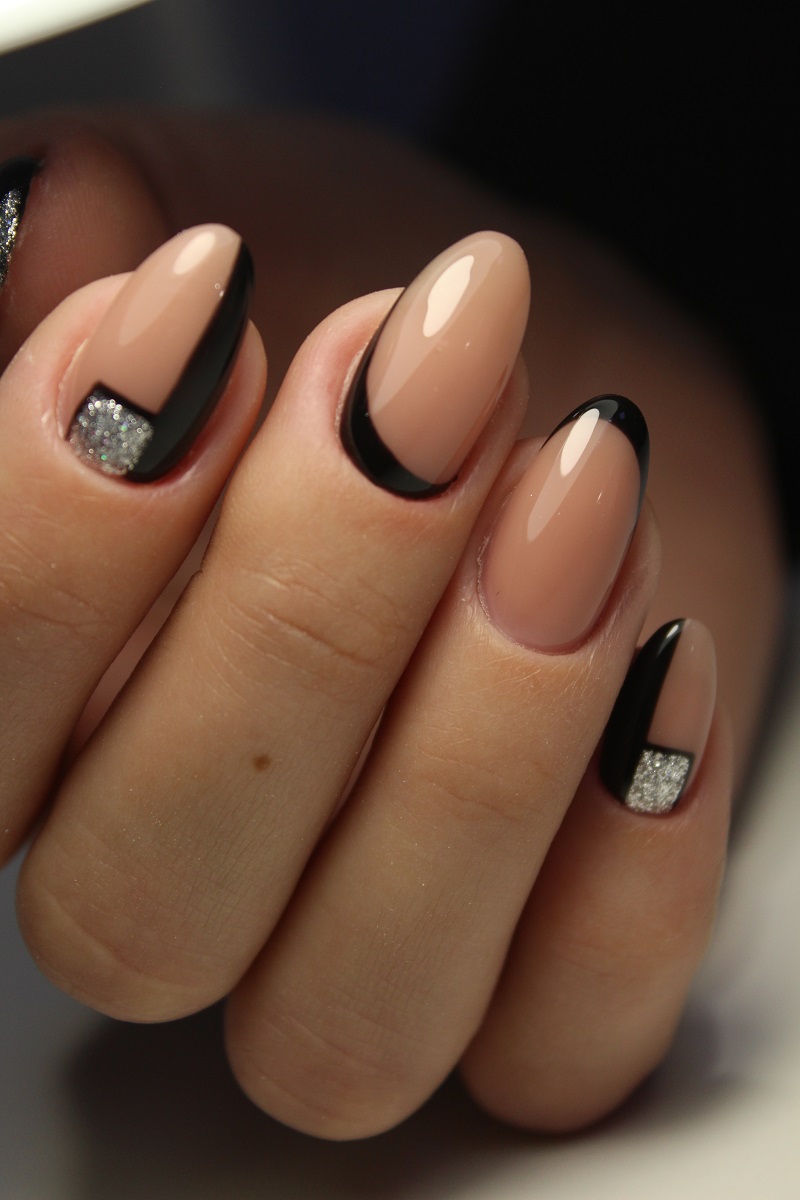 Manichiura french reinventată, în care schema clasică de culori este modificată, iar vârfurile albe și rotunde ale unghiilor sunt înlocuite de vârfuri pătrățoase, ovale - în stil migdală, mult alungite și ușor ascuțite, pictate și înmuiate în ojă neagră în loc de albă, este minunată.