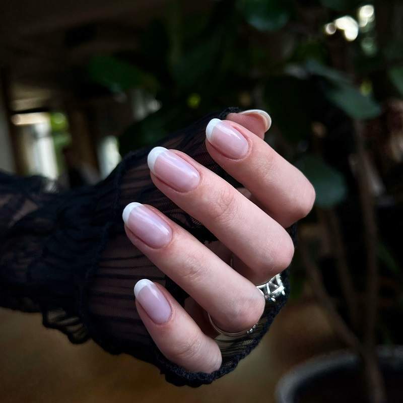 - Aplicarea bazei: începe cu o french manicure clasică, folosind un lac roz pal la bază și alb pe vârful unghiei.