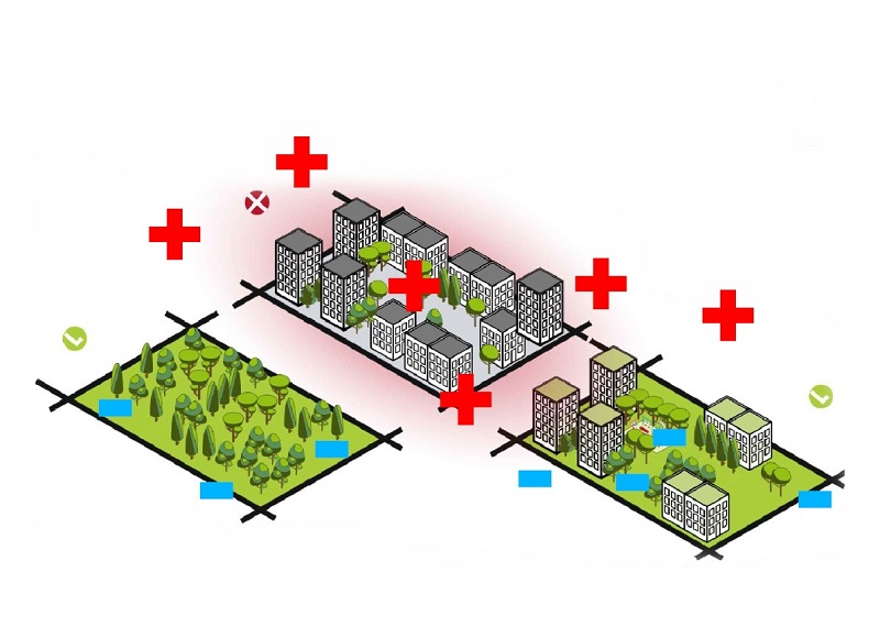 - Implementarea de strategii de planificare urbană care să favorizeze circulația aerului și crearea de spații verzi. Clădirile înalte și coridoarele dintre ele pot juca un rol crucial în acest sens, creând "curente de aer de canion" care favorizează fluxul aerului și răcirea acestuia. În consecință, o abordare verticală a construcției clădirilor, cu accent pe înălțime mai degrabă decât pe extinderea orizontală, lasă mai mult spațiu liber pentru vegetație. Impact estimat: 0,2-0,3°C.