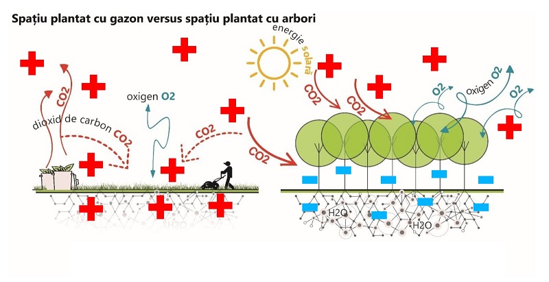 - Creșterea numărului de copaci, uzine de răcire a metropolelor, pentru a stimula fenomenul de răcire naturală prin transpirația frunzelor acestora. Fotosinteza contribuie la stocarea energiei solare sub formă de masă lemnoasă, iar capacitatea copacilor de a transforma CO2 în oxigen contribuie la un aer mai curat și un mediu mai sănătos. Impact estimat: 0,8-1°C.