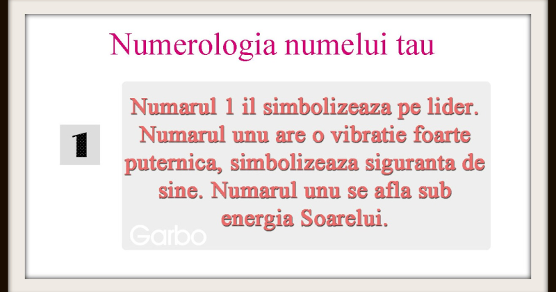 Numarul 1 il simbolizeaza pe lider. Numarul unu are o vibratie foarte puternica, simbolizeaza siguranta de sine. Numarul unu se afla sub energia Soarelui.Cuvinte cheie pozitive: independenta, creativitate, originalitate, ambitie, determinare, siguranta de sine.