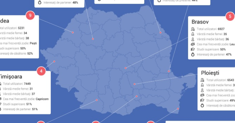În top 10 orașe active pe site-ul de dating se mai numără Timișoara, Brașov, Ploiești, Constanța, Galați, Oradea și Craiova. Cea mai scăzută medie a vârstei se regăsește în Galați, unde aceasta este de 26 de ani, în cazul femeilor, iar în cazul bărbaților - 30 de ani. În Constanța se înregistrează cel mai mare procent de utilizatori interesați de flirt (45%), iar în Oradea cei mai mulți (52%) își doresc să se căsătorească și de aceea se află pe Sentimente.ro.