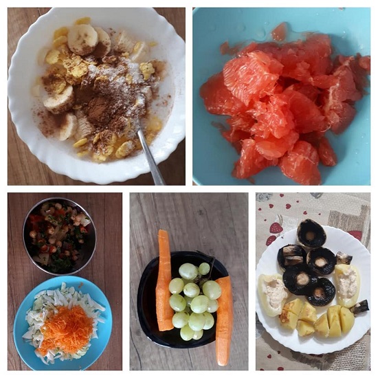 - 40 g de tofu, 50 g de salată de vinete fără maioneză, un castravete 5 roșii cherry și o felie de pâine neagră cu fibre și multicereale