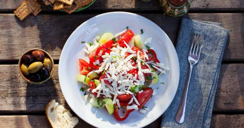 Legumele se spală și se taie în bucăți potrivite. Le punem într-un castron și le asezonăm cu sare și piper și le stropim cu ulei de măsline. Adăugăm șunca și telemeaua tăiate. Punem cele două ouă fierte tăiate și amestecăm ușor, La final, putem adăuga pătrunjelul tăiat mărunt.