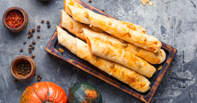 Din ingredientele pentru aluat se fac foile pentru plăcintă și se lasă la dospit, până când aluatul își dublează volumul. Se taie apoi în 4 părți egale și se întind în foi subțiri. Peste foile de plăcintă se adaugă dovleacul ras, zahărul și scorțișoara. Se rulează și se închid bine la margini. Se pun în tava tapetată cu hârtie de copt și se ung cu ulei.