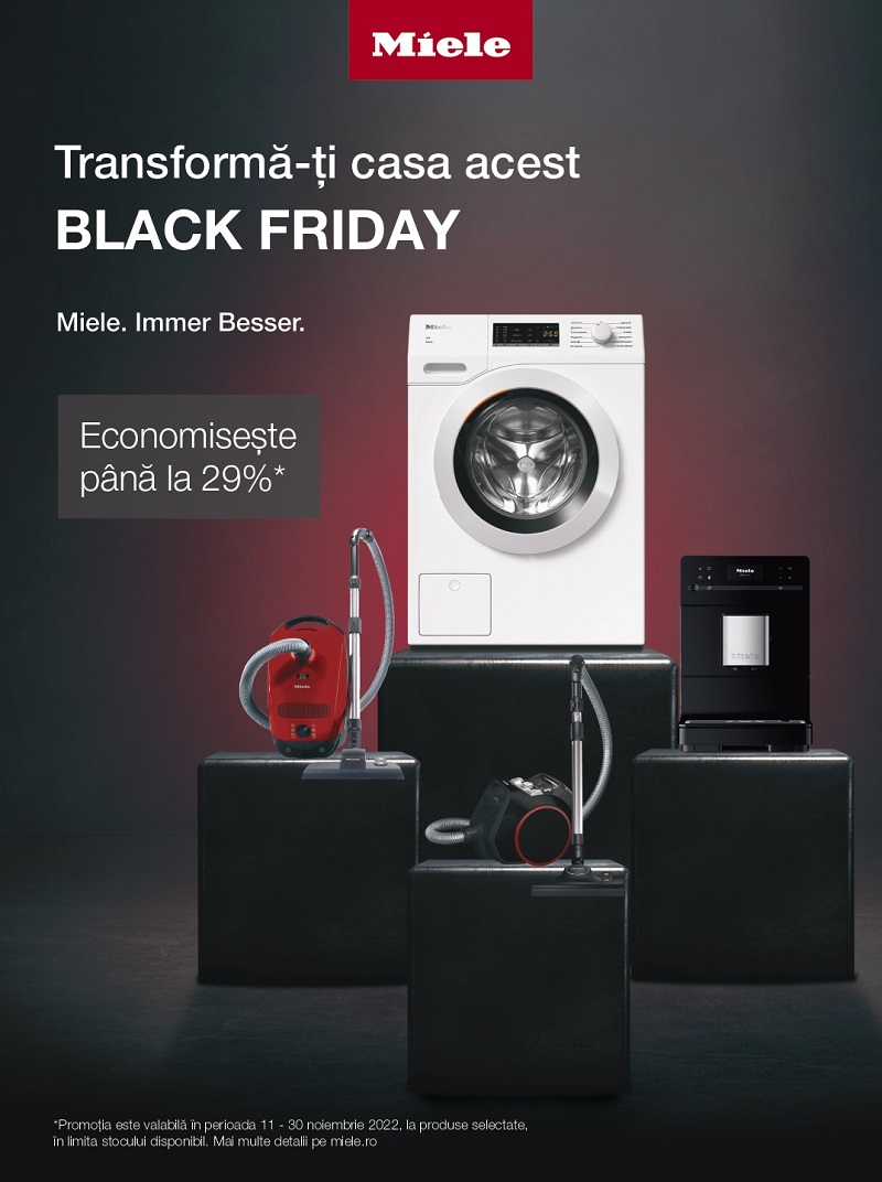 Miele, cel mai mare producător mondial de echipamente și electrocasnice premium, anunță reduceri de până la 29% în campania de Black Friday 2022. Anul acesta, reducerile vor fi disponibile în perioada 11 – 30 noiembrie și includ cele mai căutate electrocasnice de către consumatori din categoriile mașini de spălat, uscătoare de rufe, espressoare și aspiratoare. Pentru al cincilea an consecutiv, produsele care au intrat în campania Miele de Black Friday au fost selectate de consumatori, care și-au putut vota online preferatele.