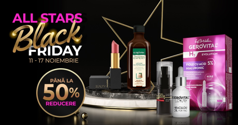 Între 11 și 20 noiembrie, produsele din portofoliul Farmec vor fi disponibile la cele mai mari reduceri din an atât in magazinul online, cât și în cele 31 de magazine de brand din toată țara. În catalogul campaniei All Stars Black Friday se vor regăsi produse pentru ten, corp, păr și produse de make-up din toate gamele – de la produsele de tip fiolă, bestsellerul fiecărei ediții de Black Friday derulate de Farmec, până la produsele din gamele profesionale, de lux sau dermatocosmetice.