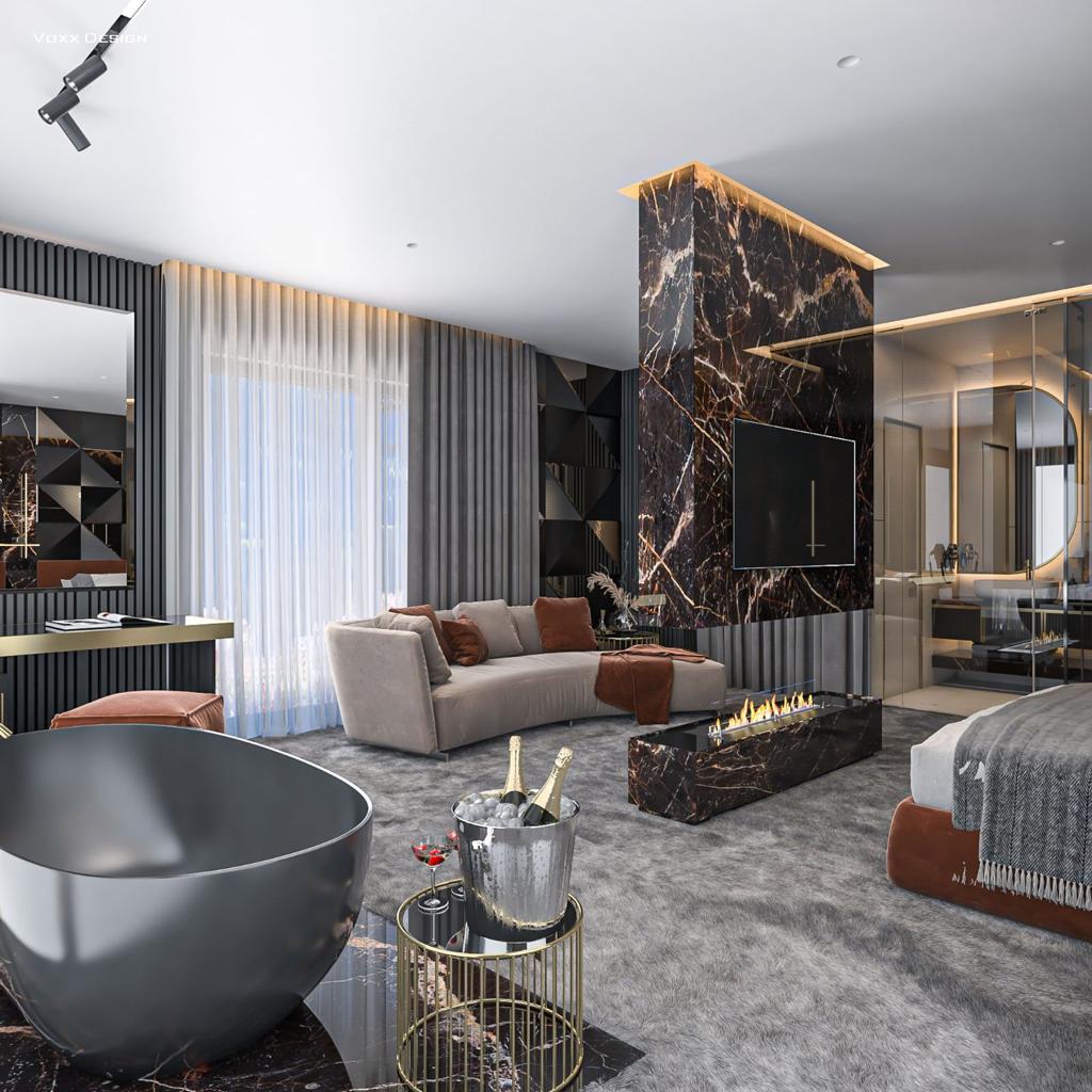 Camerele dispun de geamuri imense, cele mai mari deținute de un proiect hotelier din România, de unde se pot vedea, în toată splendoarea lor, Munții Bucegi. Unitățile de cazare vor dispune de sistem smart home, cu scenarii diferite de ambient, draperii electrice, băi din sticlă, cadă freestanding custom made, șemineu, wine bar, încălzire și răcire cu ventiloconvectoare (4 țevi, aer rece/cald) + încălzire în pardoseală. De asemenea, fațada ventilată, de cea mai bună calitate, va spori confortul și siguranța viitorilor clienți.