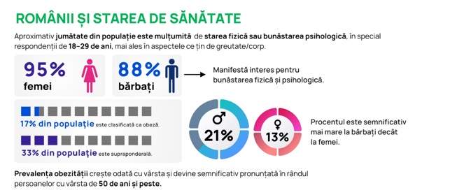 Îmbucurător este însă faptul că 95% dintre români, cel mai mare procent la nivelul celor opt țări europene analizate, spun că și-ar dori să facă cel puțin o schimbare legată de sănătate în stilul lor de viață. Prioritățile includ reducerea stresului (50%), menținerea greutății potrivite (42%), mâncarea mai sănătoasă (41%) și practicarea regulată a sportului (40%).