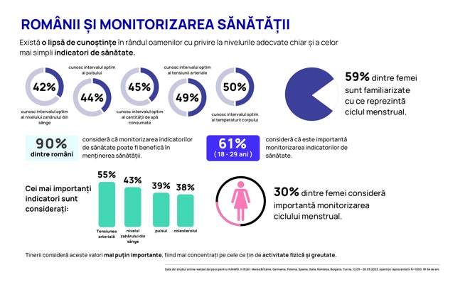 În schimb, românii au mai multe cunoștințe despre indicatorii de sănătate în comparație cu germanii, englezii, spaniolii sau italienii. Cu toate acestea, există o lipsă de cunoștințe în rândul oamenilor cu privire la nivelurile adecvate chiar și în cazul celor mai simpli indicatori de sănătate, precum temperatura corpului, cu doar 50% dintre persoanele care sunt conștiente de intervalul optim, tensiunea arterială cu 49%, cantitatea de apă consumată cu 45%, pulsul cu 44% și nivelul zahărului din sânge cu 42%. 59% dintre femei sunt familiarizate cu ce reprezintă ciclul menstrual.