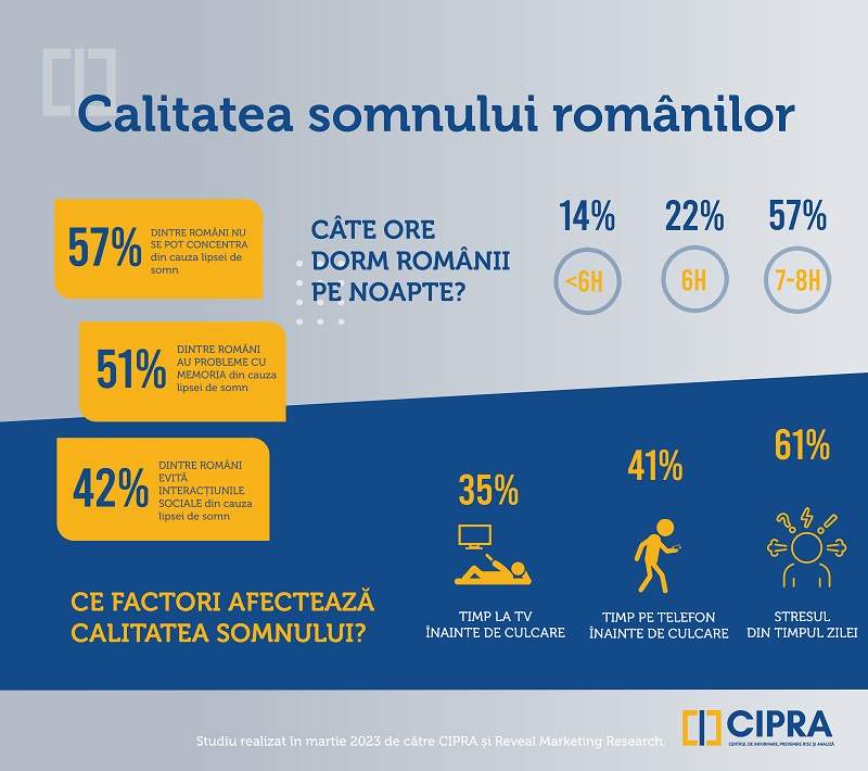 Rezultatele studiului anual realizat de asociația CIPRA - Centrul de Informare, Prevenire Risc și Analiză confirmă importanța majoră a somnului în viețile românilor, acesta situându-se pe locul 2, după alimentație, în topul aspectelor cu impact asupra calității vieții. Pentru femei, impactul modului în care se odihnesc este sensibil mai mare, cu un procent de 57%, comparativ cu 50% pentru bărbați.