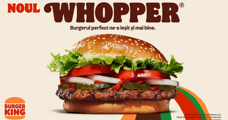 Încă de la debutul său din 1957, Whopper-ul a fost un simbol al calității și al aromelor îndrăznețe. Cu patty din carne 100% de vită, preparată la grătar cu flacără, și legume proaspete, Whopper-ul a revoluționat industria restaurantelor cu servire rapidă. Acum, în timp ce brandul celebrează 70 de ani la nivel global, Burger King ridică ștacheta, oferindu-le clienților săi fideli din România un Whopper și mai gustos.