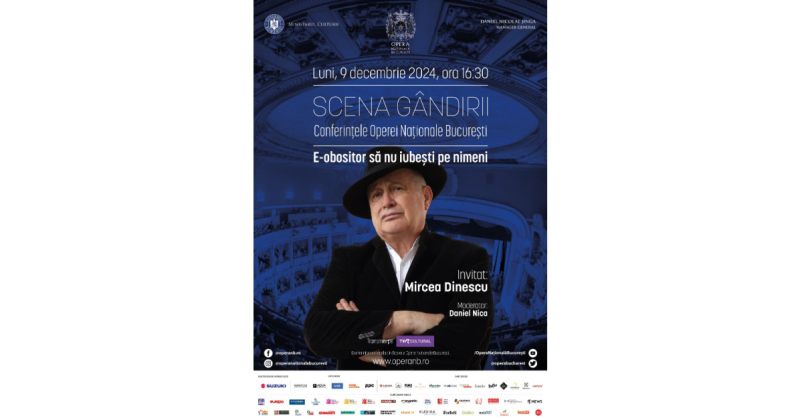 Prelegerea domnului Mircea Dinescu va fi urmată de un dialog cu moderatorul și coordonatorul programului de conferințe al Operei, Daniel Nica, filosof, lector universitar la Facultatea de Jurnalism și Științele Comunicării (Universitatea din București). Atât prelegerea, cât și dialogul vor fi însoțite de scurte momente muzicale, interpretate de artiștii Operei Naționale București.