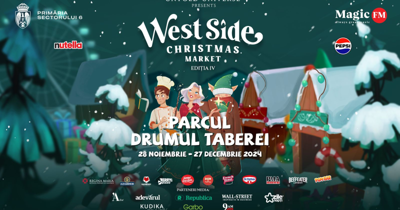 “West Side Christmas Market” readuce magia Crăciunului în Parcul Drumul Taberei din Sectorul 6 din București. Târgul de Crăciun organizat de UNTOLD UNIVERSE, în parteneriat cu Primăria Sectorului 6, este primul târg din București care își deschide porțile, joi, pe 28 noiembrie, începând cu ora 17:00. Ne așteaptă 30 de zile pline de farmec care vor aduce în Parcul Drumul Taberei din Sectorul 6, din București, strălucire, culoare, magie, savoare, emoție, distracție și sărbătoare. Evenimentul de deschidere include momente speciale precum: aprinderea luminilor festive, concert Direcția 5 și spectacol de artificii. Weekend-ul 29 noiembrie - 1 decembrie aduce show-uri live susținute de Fuego, Irina Sârbu și Viorica Pintilie și o mulțime de surprize pentru participanți. “West Side Christmas Market” va rămâne deschis până pe 27 decembrie.