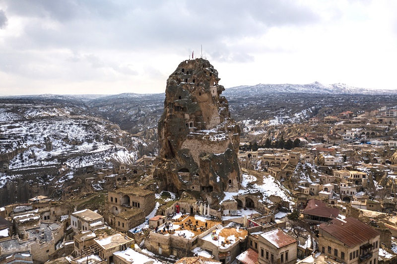 În centrul localității se înalță Castelul Ortahisar, o formațiune naturală masivă transformată într-o fortificație ce pare desprinsă din povești. Se crede că a fost săpat încă din perioada hitiților și include peșteri, adăposturi pentru porumbei și tuneluri întortocheate, fiind considerat unul dintre primele așezări cu mai multe niveluri din lume. Astăzi, castelul oferă unele dintre cele mai impresionante panorame din întreaga regiune.