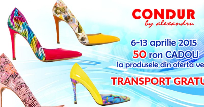 Indiferent daca alegerea consta intr-o pereche noua de pantofi stilleto in culorile vedeta ale primaverii-verii 2015 – verde, galben intens, rosu, corai, oranj, albastru marin, turquoise, violet, beige nude, nude rose, auriu, bronz – sau intr-o pereche de sandale elegante cu barete fine din piele lacuita sau cu presaj, surpriza descoperii CONDURilor fermecati in preajma sarbatorilor de Paste este sustinuta de oferta speciala conceputa de marca romaneasca pentru a rasplati fidelitatea clientilor.