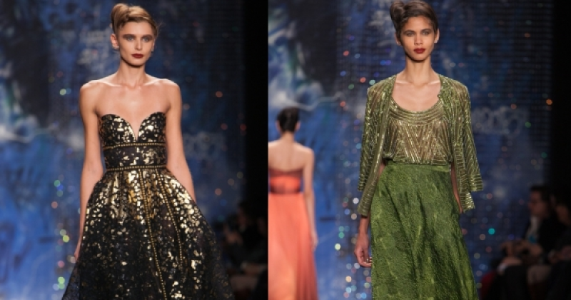 O colectie care iti taie respiratia! Mult alb si negru, si mai mult auriu si sclipiri de paiete, rosu in degrade sau inflorat, broderii ornamentale si dantele minunate, crapaturi indraznete, cape, materiale stralucitoare si rochii care parca plutesc, colectia Naeem Khan Toamna/ Iarna 2015-2016 este una ravasitoare.