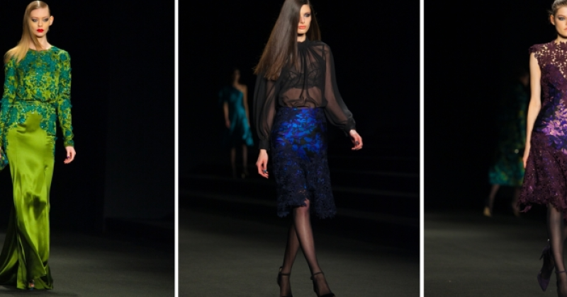Designerul Monique Lhuillier nu a mizat insa doar pe delicatetea si efectul puternic al florilor, ci a apelat si la elemente glamorous, epatante. Paleta cromatica a colectiei este una variata si vibranta, nuantele de verde, galben, albastru, mov, indigo, marsala scotand cel mai bine la iveala femeia sexy si delicata, dar increzatoare in ea insasi