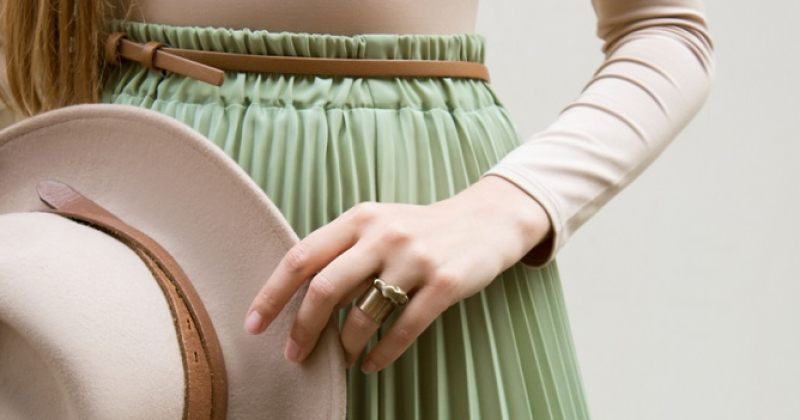 O fustă midi cu pliuri din material elastic și în croială cloș. Aceasta este ideală de purtat la locul de muncă sau la școală pentru că este foarte cuminte ca look, iar culoarea este una extrem de plăcută. În talie este prevăzută cu un accesoriu tip curea. Se poate purta atât cu încălțăminte sport, cât și cu una elegantă cu tocuri.
