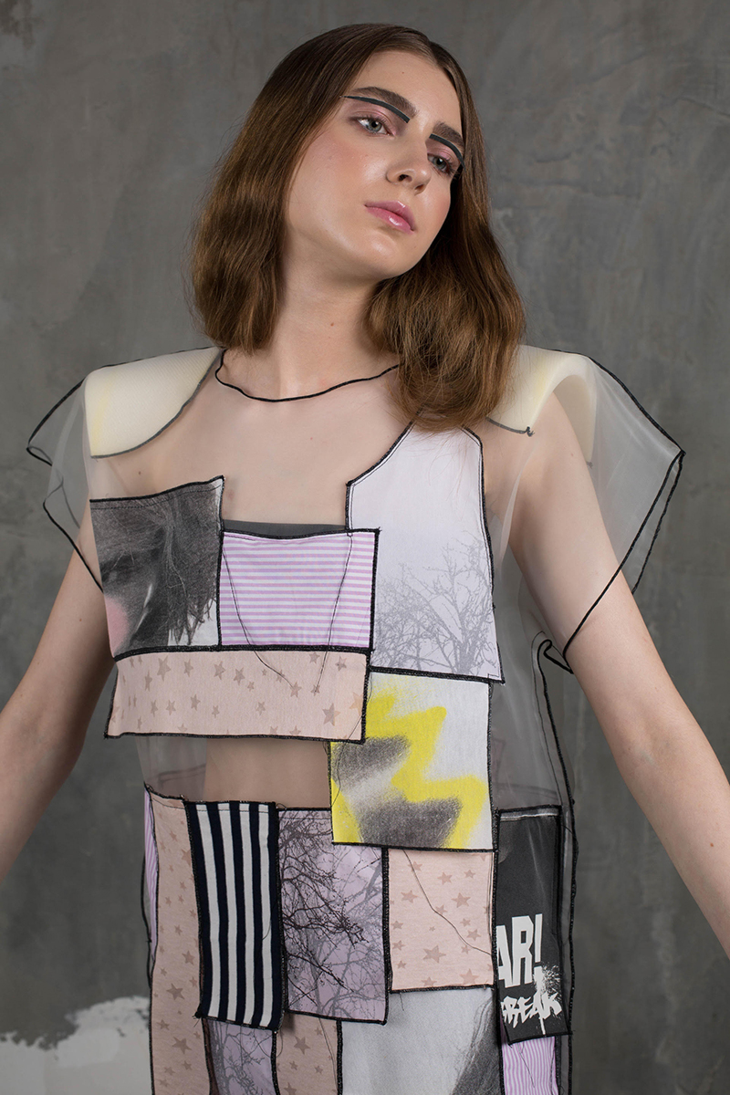“Ok, am să vorbesc aici despre piesele complexe pe care le confecționăm. Ce am încercat să propunem și să dezvoltăm în anul 2019 a fost un sistem prin care toate resturile textile rezultate în procesul de croire industrial să fie ori recroite pentru a obține module pentru un nou articol vestimentar, sau să fie aranjate și cusute pentru a reconstrui un nou material textil. Prima direcție a acestui sistem modular deconstruiește tiparele de bază clasice pe anumite “linii de referință”, cum ar fi linia bustului, linia taliei, a șoldului, etc și apoi divide suprafețele mai puțin complexe rezultate în module. Aceste module pot fi optimizate prin calcule cu privire la forma lor pentru a se încadra în resturile disponibile și de asemenea cu privire la numărul de tipuri – cu cât sunt mai puține tipuri, cu atât mai bine. Cea de a doua direcție se referă la modulele care nu se încadrează în prima și care urmează să recreeze un nou material textil oarecum “artistic”, folosind diferite tehnici. Modulele cu geometrii simple vor fi folosite pentru a recompune materiale textile cu model pe baza tehnicilor de tip patchwork sau crazy quilt, în timp ce acelea cu o formă de fâșie vor fi folosite în tehnici de tip “țesut” sau “impletit”, sau pentru a crea franjuri sau alte tipuri de aplicații decorative. Prototipurile colecției au fost produse din circa 1mc de deșeuri textile, iar în urma procesului au rezultat circa 10cmc de deșeuri (de tipul ațelor sau tăieturilor de triplock) care au fost înglobate ulterior în prototipurile colectiei de vară. Așadar “zero waste”. Procesul de recompunere a textilelor este unul foarte laborios pentru că noi, practic, ne confecționam materialul de bază (manopera este cel puțin dublă față de un produs clasic) și de cele mai multe ori avem nevoie de două procese de croire (unul pentru module și unul pentru produsul final). Confecționarea unui articol din Collection 1 durează între 16-24 de ore de muncă efectivă calificată și cere implicarea designerului pentru fiecare produs în parte, cel puțin în faza inițială de aranjare a textilelor diferite pentru a forma pattern-ul final. Acestea fiind spuse, cu ceva calcule simple, am observat că avem costuri foarte mari pe fiecare produs în parte și totuși ideologia brandului impune popularizarea upcyclingului. Prin urmare, am încercat și vom încerca în continuare să facem și produse accesibile care să pastreze caracterul de unicat, iar pe de altă parte ne dorim să cercetăm mai departe și direcția complexă descrisă mai sus, care va putea la un moment dat transforma orice brand de îmbrăcăminte într-unul care să producă 0 deșeuri.