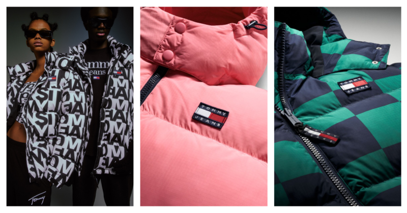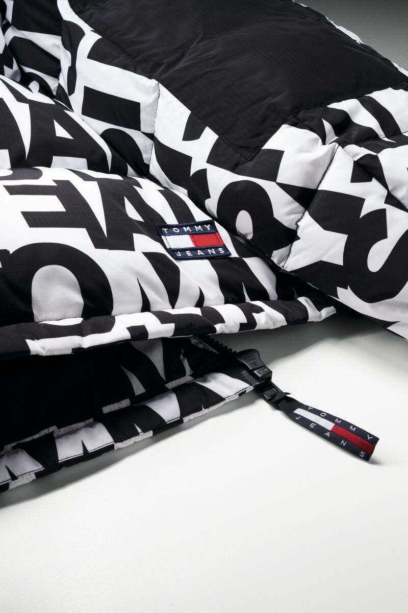 O alternativă de asemenea eco friendly pentru femei este jacheta puffer cu imprimeu din nou checkboard, doar că de data aceasta carourile sunt înlocuite de logo-ul Tommy Jeans, în nuanțe de alb și negru.