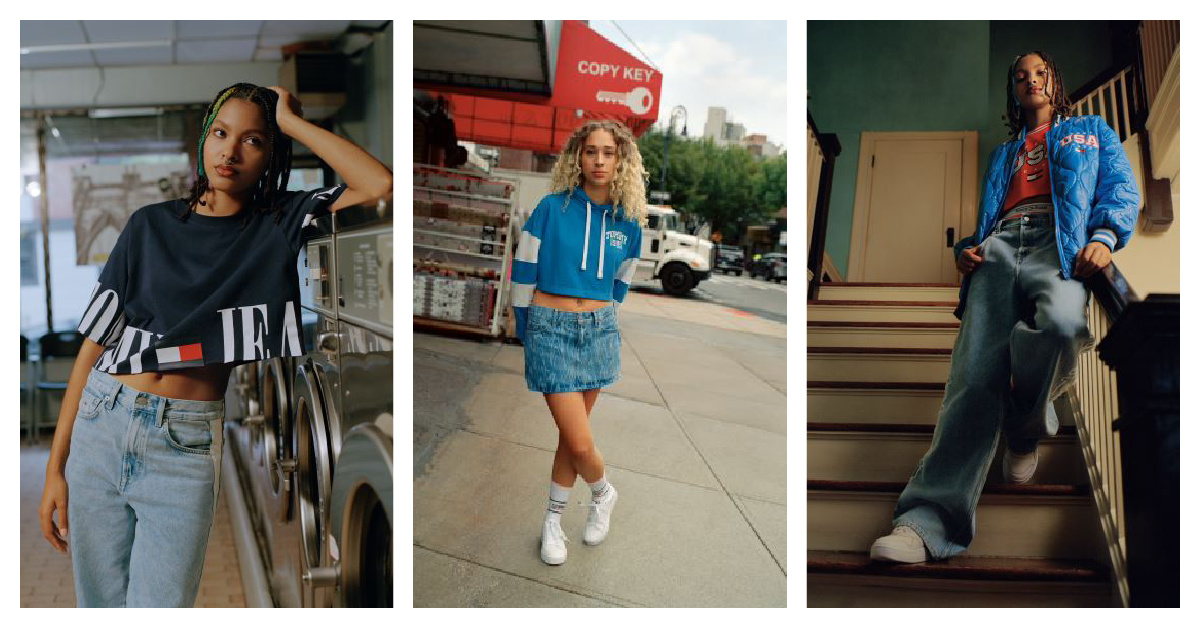 Produsele cheie sunt blugii Aiden pentru bărbați și pentru femei cei cu croiala Daisy. Blugii Aiden sunt oversized și cu tur lăsat, în timp ce blugii Daisy sunt wideleg, cu talie joasă, oferind o notă actuală stilului prep din TOMMY JEANS. Fie că se regăsește în produse cu croială baggy, emblematicii blugi cu straight leg, o fustă micro sau o jachetă bomber oversized, denimul este prezent într-o gamă mai largă de produse și continuă să joace un rol central în colecție, oferind consumatorilor instrumentele necesare pentru a se exprima pe deplin. În colecție se găsesc și jacheta windbreaker Chicago, tricouri îndrăznețe cu dungi, pantaloni scurți și tricouri inspirate de skate și pulovere strălucitoare.