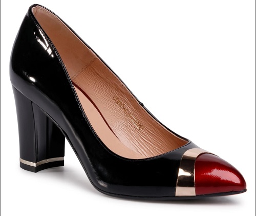 Pantofii negri nu se vor demoda niciodată și sunt ușor de adaptat oricărei ținute. Cu toate acestea, există câteva mici detalii care pot face o diferență majoră între o pereche de pantofi de zi și un astfel de element statement. Prin urmare, pentru o ținută specială e nevoie de încălțăminte în același ton. De aceea, următoarea recomandare este o pereche de pantofi negri, lăcuiți, cu vârful colorat și un mic detaliu auriu care îi pune în evidență.